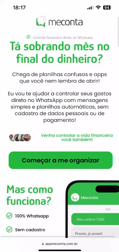 Eu vou te ajudar a controlar seus gastos direto no WhatsApp com mensagens simples e planilhas automáticas, sem cadastro de dados pessoais ou de pagamento!